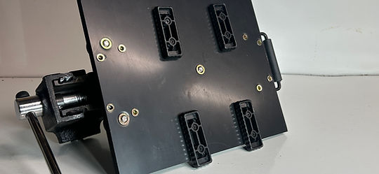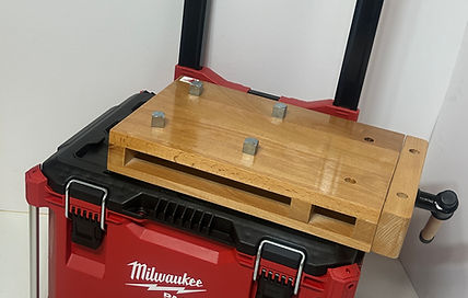 RED 3 1/2" BENCH VISE WITH BLACK PLATFORM COMPATIBLE ONLY WITH MILWAUKEE PACK OUT. CAN ALSO BE USED ON ANY FLAT SURFACE WITH ADDITIONALLY PURCHASED FEMALE CLEATS. CLAMP MOUNTED DEAD BLOW HAMMER 9AS SEEN IN PHOTO), ADDITIONAL $20.00
